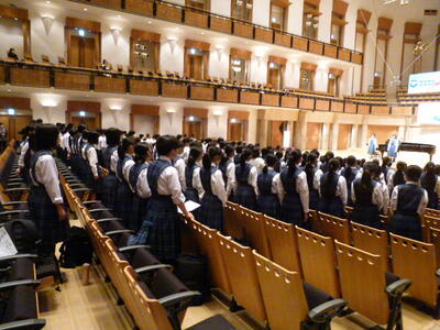 3年3組が親善音楽会に参加しました!これは出発前の学校での様子。みんな出発直前まで一生懸命練習し、最後は気合を入れて『えいえいオー!!』気持ちを一つにし、学校を出発しました!3年3組の皆さん、ミューズでさらに素晴らしい歌声を響かせてきてください!!